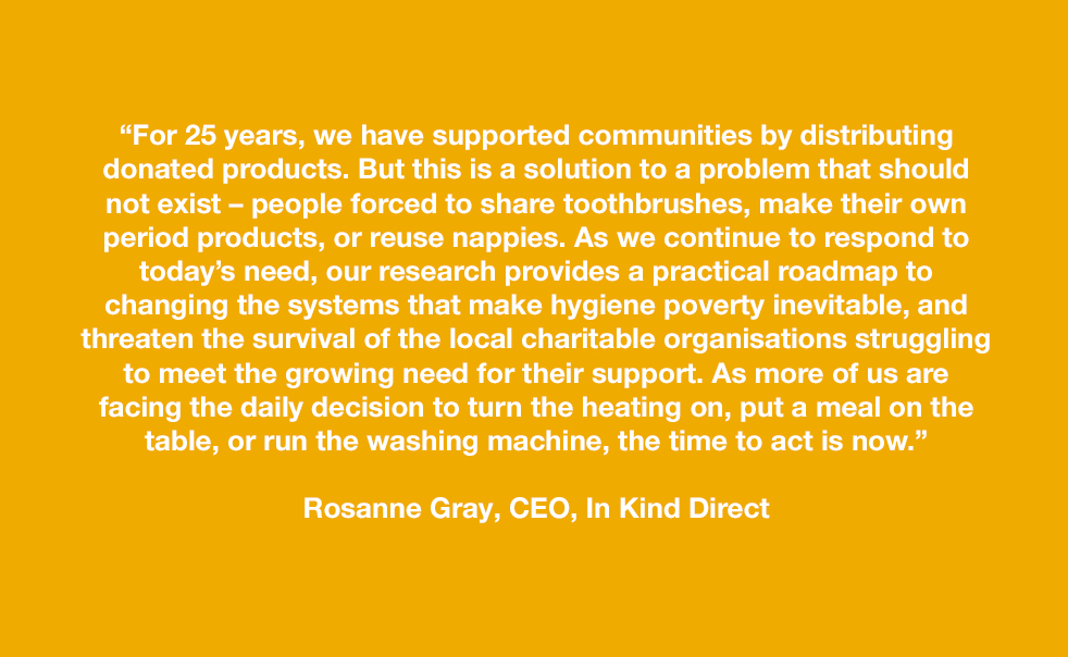 In this report, In Kind Direct has developed a roadmap of actions that can have the greatest leveraging effect to end hygiene poverty. We believe the next step is the development of a practical and timebound National Implementation Plan, supported by the creation of a dedicated Hygiene Poverty Alliance.